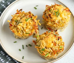 Snijd de bosui en (geroosterde) paprika in stukjes. Meng in een kom de aardappel, 1 ei, 2 el bloem, paprika, bosui, kruiden en geraspte kaas door elkaar. Vul vervolgens circa 6 ingevette muffinvormpjes met het aardappelmengsel.