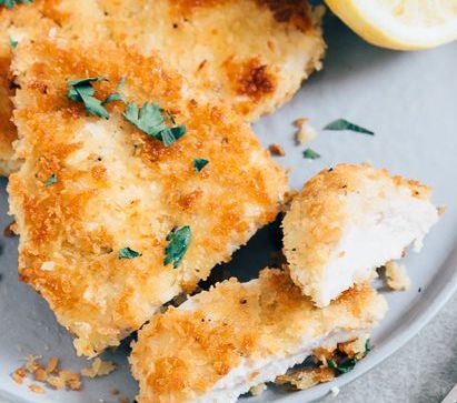 - Serveer de kipschnitzel traditioneel met wat fijngehakte peterselie en een schijfje citroen.