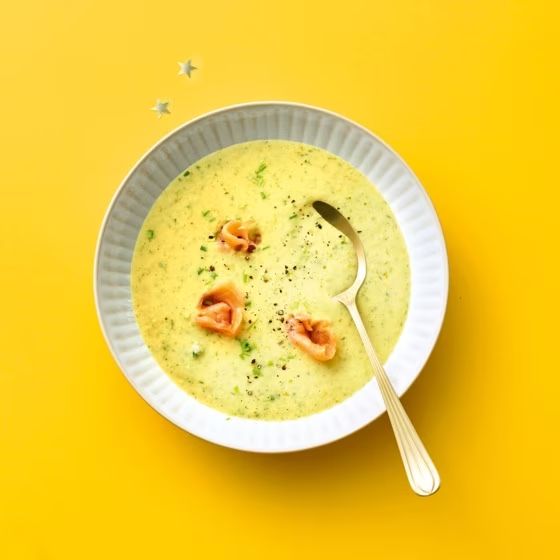 Verdeel de zalm in repen en knip de bieslook fijn. Verdeel de soep over 4 borden. Maak roosjes van de repen zalm door ze op te rollen, leg in de soep en bestrooi met de bieslook.