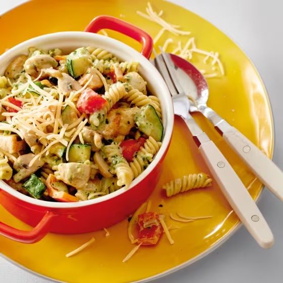 Pasta pesto met kip en courgette
