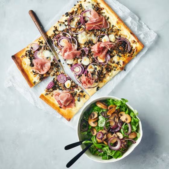 Rol intussen het pizzadeeg met het bakpapier uit over een bakplaat en bestrijk met de mascarpone. Snijd de rode uien in halve ringen. Verdeel de gebakken champignons over de pizza. Leg er de helft van de rode ui op.
